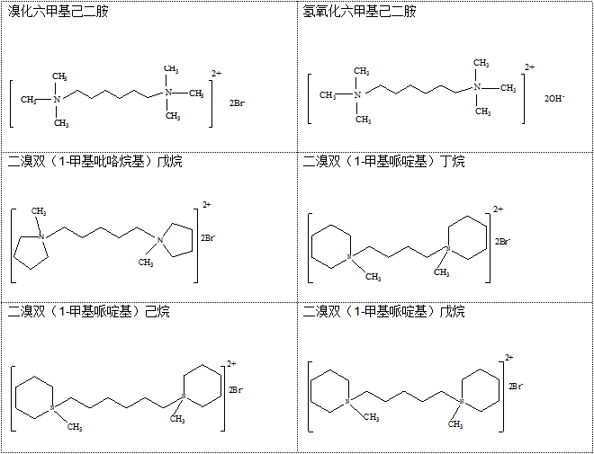 模板劑在分子篩的合成中起到模板,結(jié)構(gòu)導(dǎo)向,空間填充劑,平衡骨架電荷影響產(chǎn)物骨架電荷密度等多種作用,它對分子篩類型結(jié)構(gòu)孔道大小、比表面積甚至活性有很大的影響。我們致力于高品質(zhì)季銨堿(低金屬離子、低鹵素離子)模板劑的開發(fā),以及新型模板劑的設(shè)計和研究,如雙氮季銨堿化合物:
